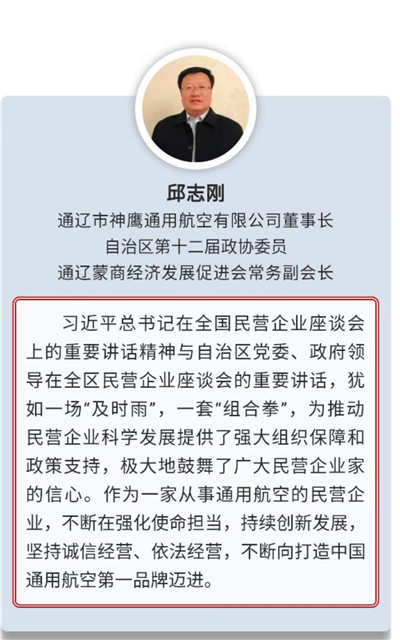 通遼市神鷹通用航空有限公司董事長、自治區(qū)政協(xié)第十二屆委員會委員邱志剛,作為自治區(qū)企業(yè)家代表應(yīng)邀參加了此次座談會。會后,按照自治區(qū)統(tǒng)戰(zhàn)部的統(tǒng)一部署,提交了參加座談會的收獲與感受,表示:一定要認(rèn)真貫徹布小林主席講話精神,不斷在強化使命擔(dān)當(dāng),持續(xù)創(chuàng)新發(fā)展,堅持誠信經(jīng)營、依法經(jīng)營上下功夫,不斷向中國通用航空第一品牌邁進(jìn)。